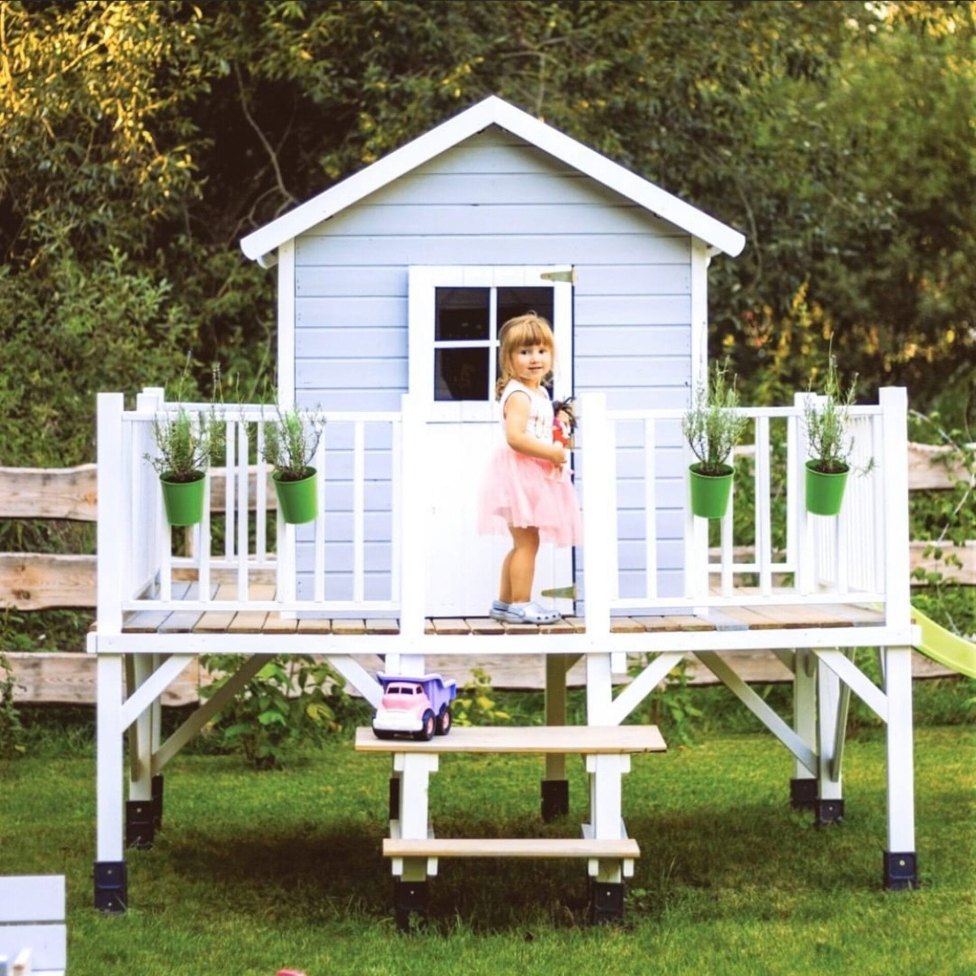 - Avontuurlijk ontwerp: verhoogd platform en balkon nodigen uit tot fantasierijk spel