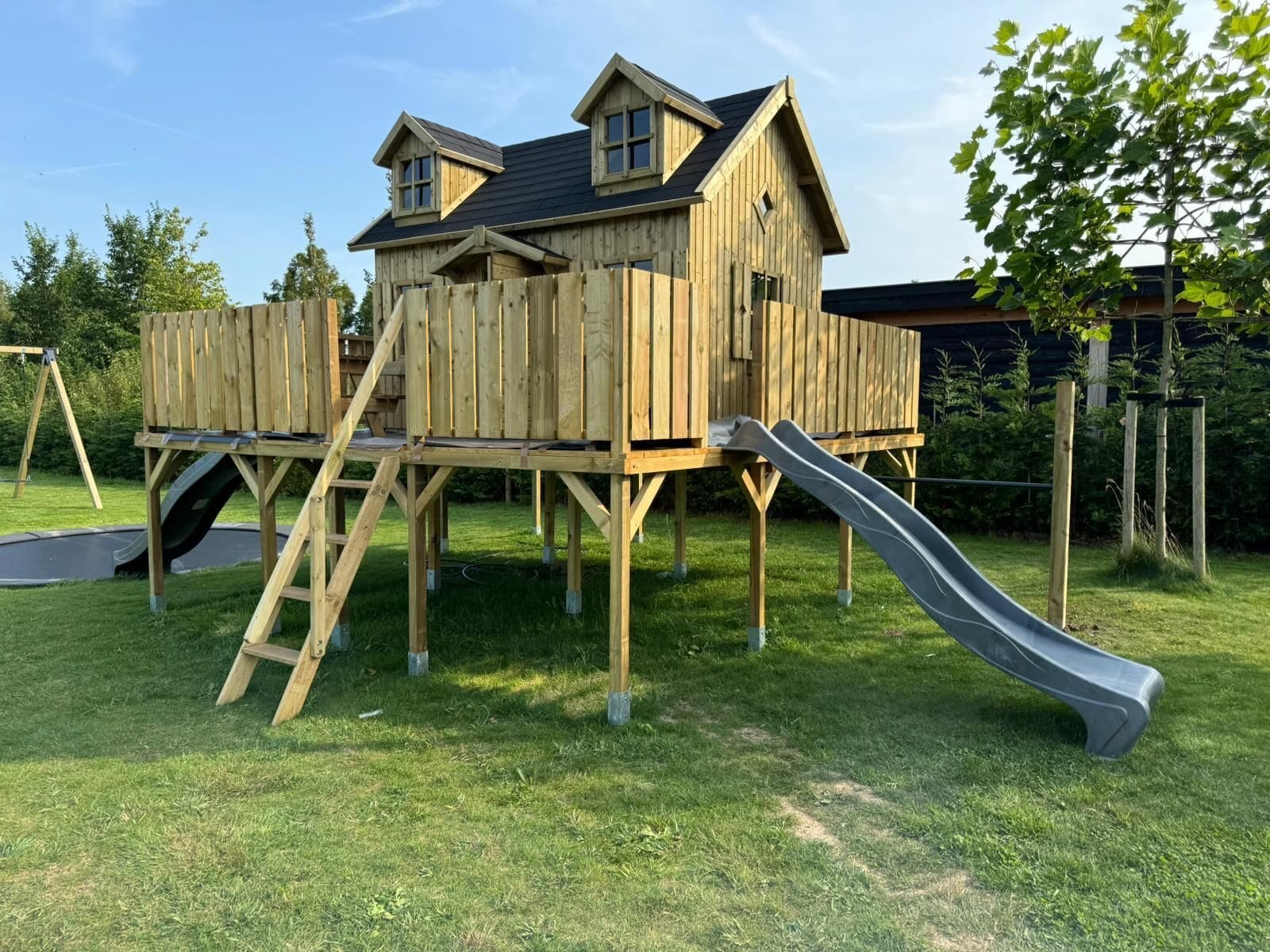 - Ruim houten speelhuis met verdieping en twee dakkapellen