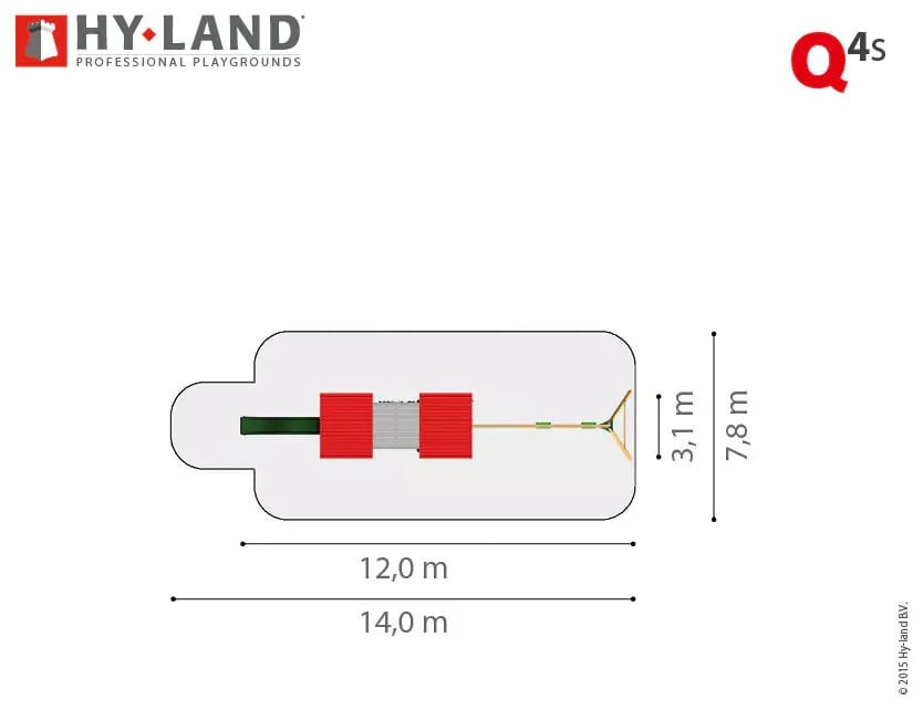 Dankzij het drievoudige speelplatform, de zware dubbele schommel en uitgebreide klimvoorzieningen vormt de Q4S een indrukwekkende en duurzame speeloplossing binnen de Hy-Land S-serie.